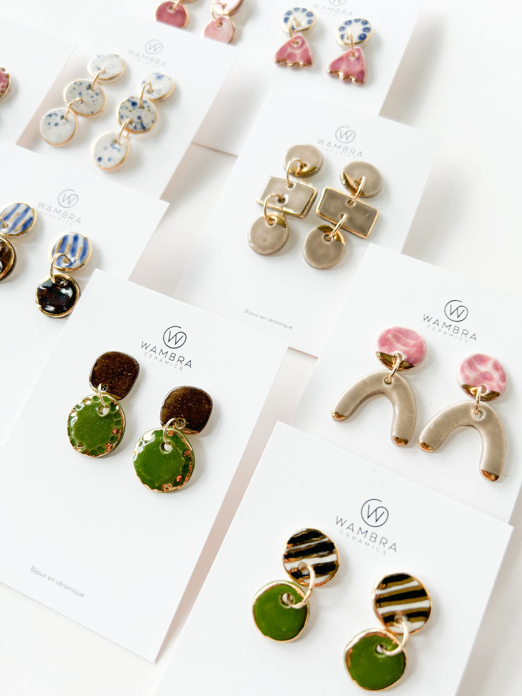 Handmade ceramic jewelry, meticulously crafted from high-fired porcelain and adorned with genuine 22 karat gold lustre. This captivating collection is elegantly assembled using 14 karat gold plated stainless steel, ensuring both durability, elegance and comfort.