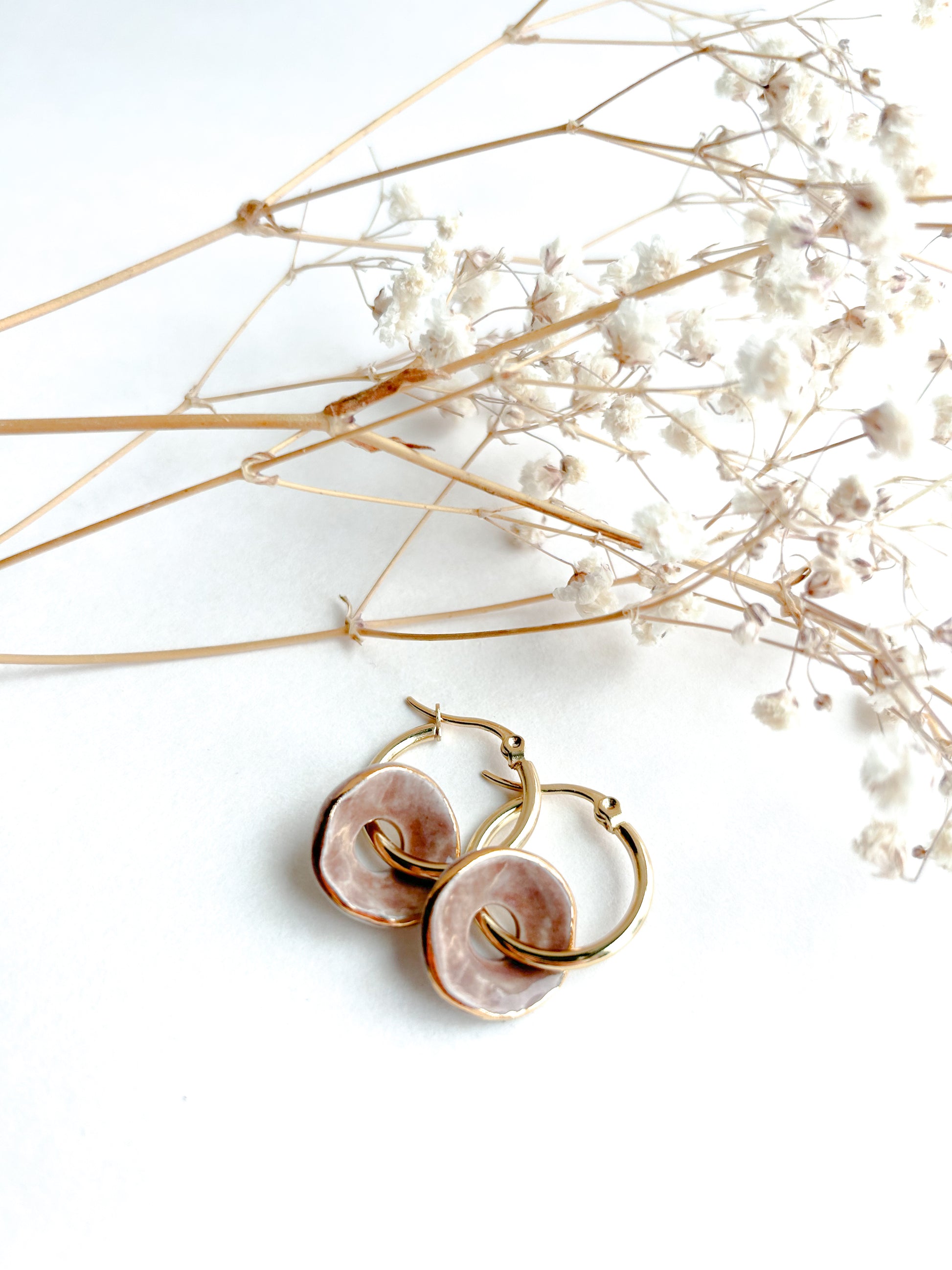 Part of the DONNA Collection, these earrings are designed to elevate your daily wardrobe with a refined artistic touch. Each pair is carefully handbuilt and handpainted using high-fired porcelain, then finished with a delicate layer of 22k gold luster to bring out their timeless charm.